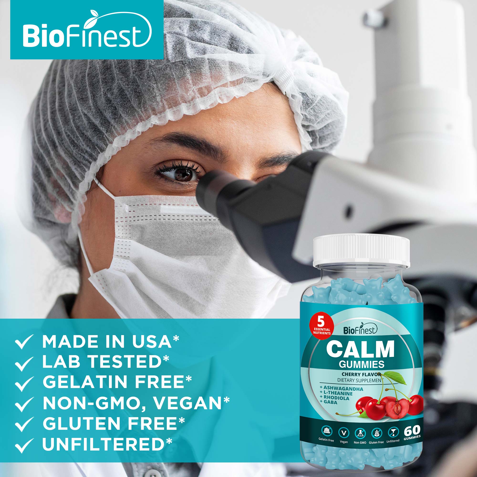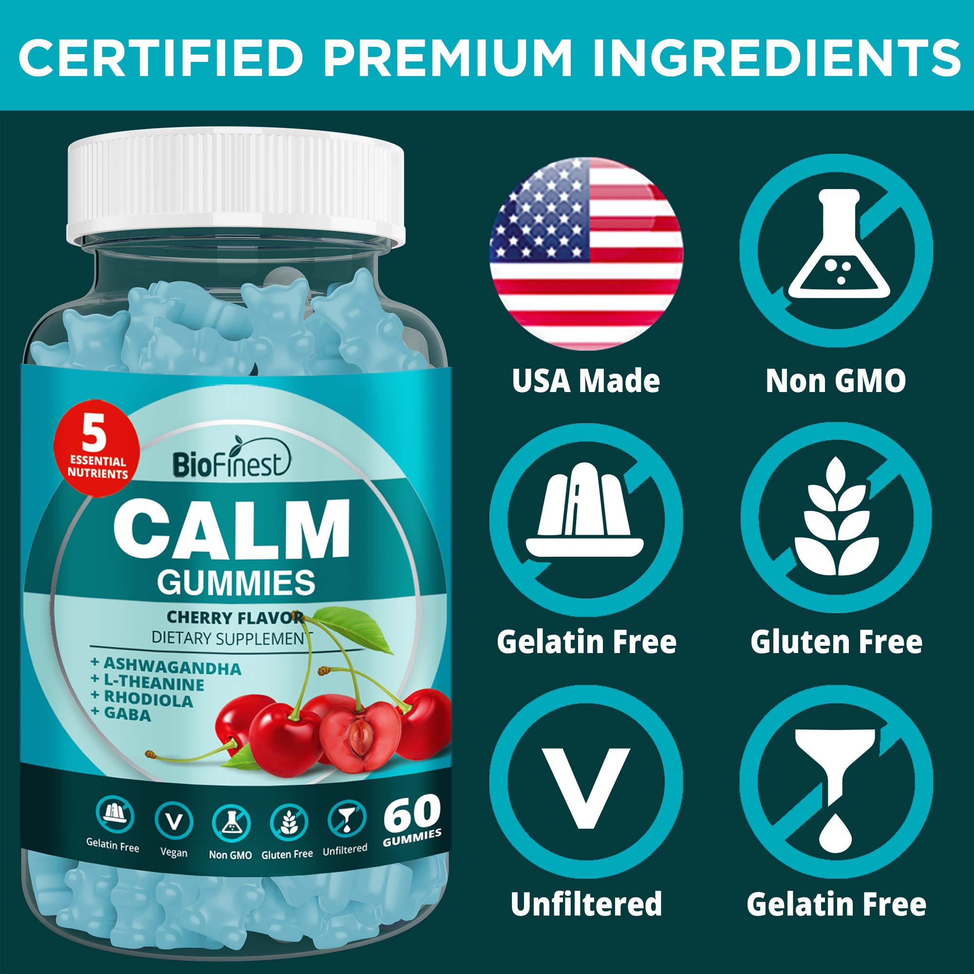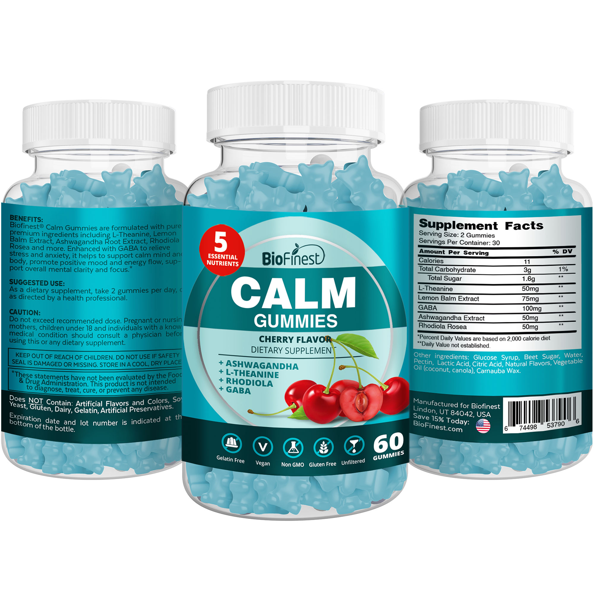 Biofinest Calm™ Gummy Supplement - L-Theanine Lemon Balm Extract Ashwagandha Root Rhodiola Rosea GABA - Relieve Stress Anxiety Calm Mind Body Energy Flow Mental Focus Men Women Health - Made in USA Vegan Fruity Taste - Cherry Flavor (60 Gummies)