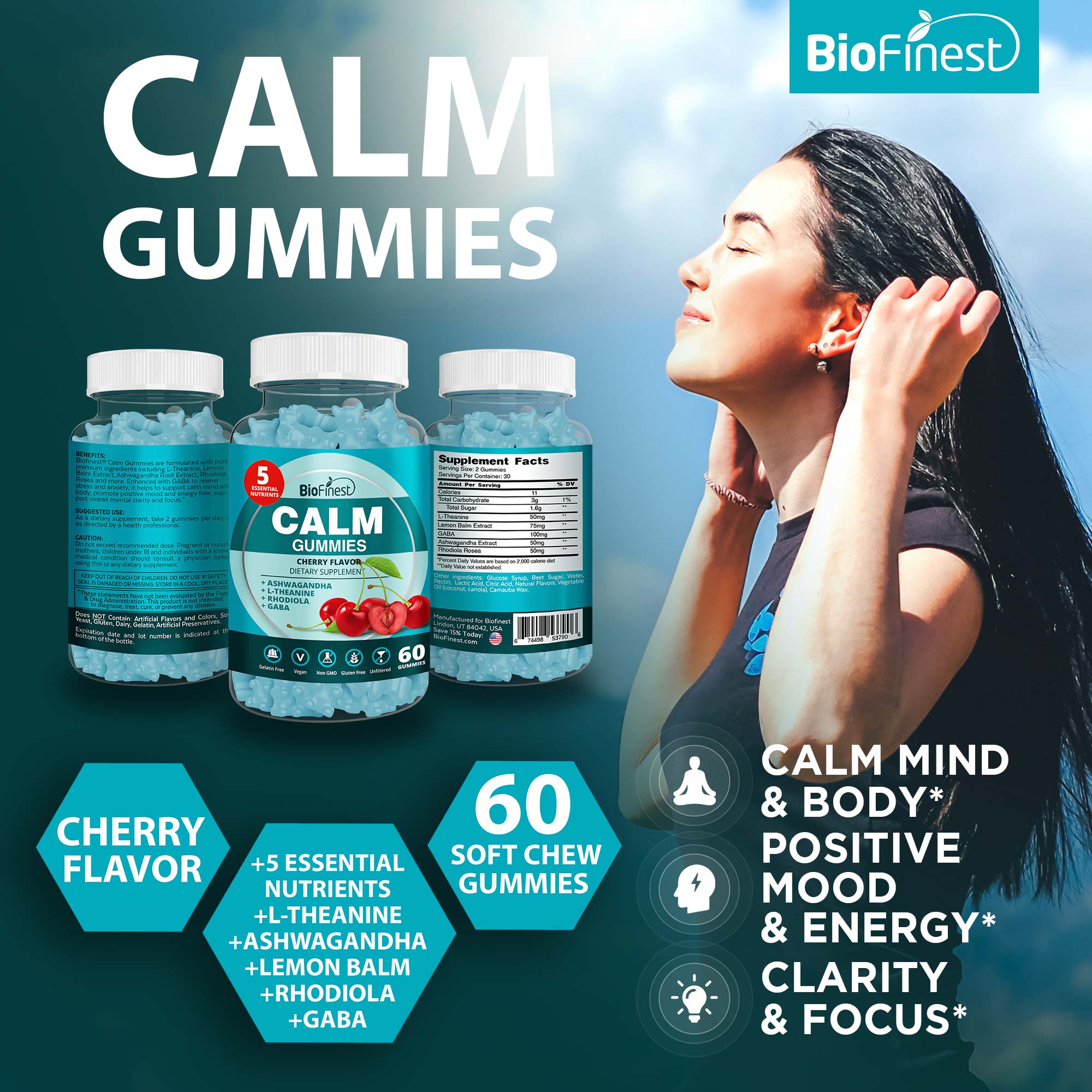 Biofinest Calm™ Gummies are formulated with pure premium ingredients including L-Theanine, Lemon Balm Extract, Ashwagandha Root Extract, Rhodiola Rosea and more.