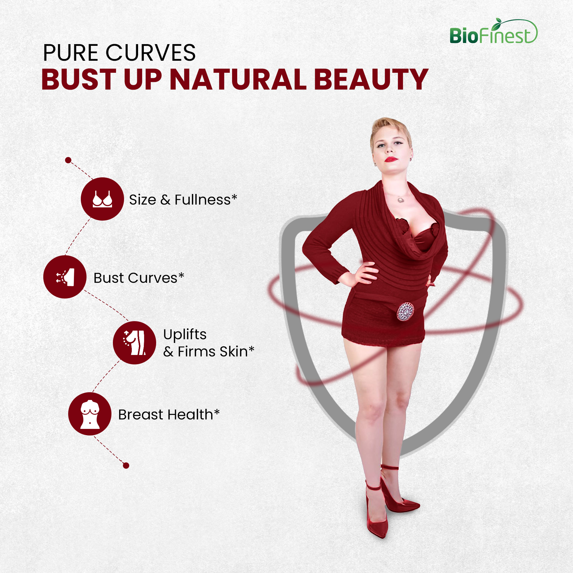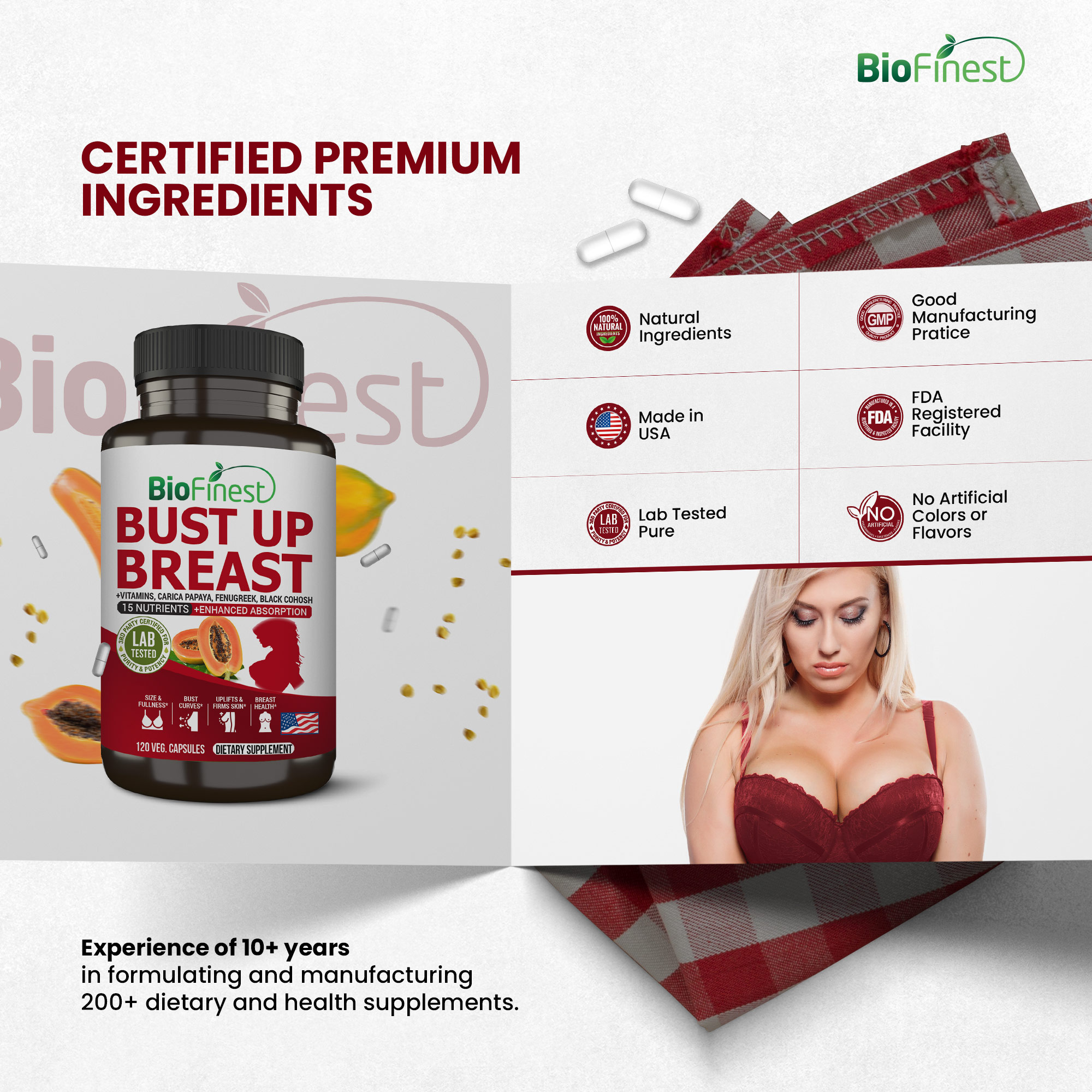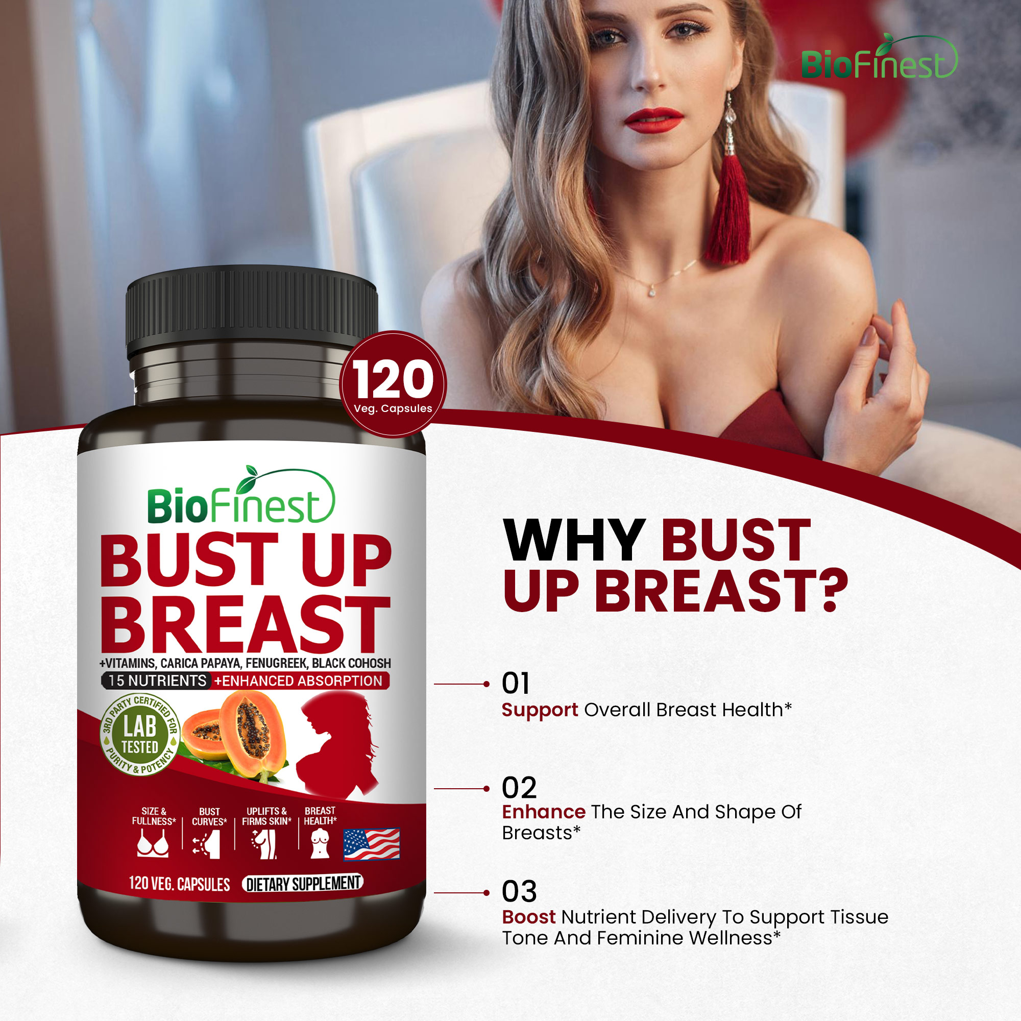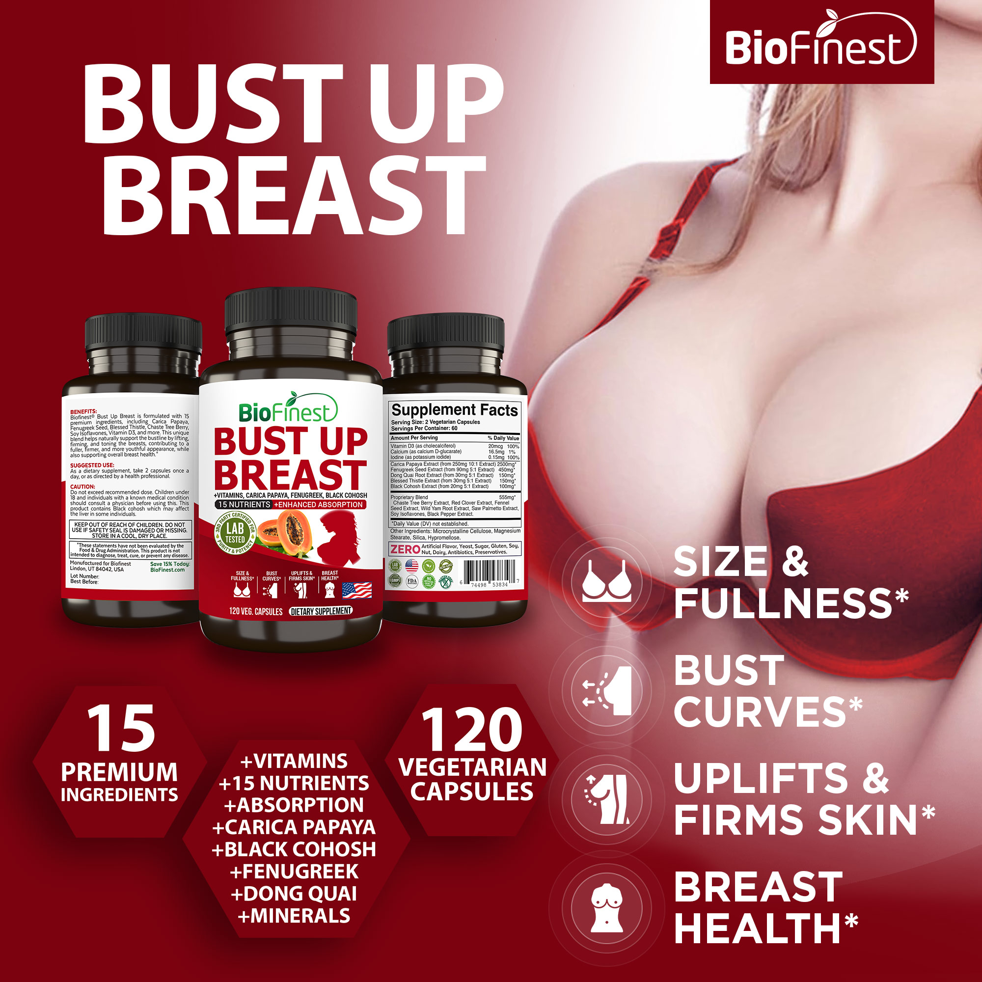 Biofinest® Bust Up Breast supplement is formulated with 15 essential nutrients to help support breast health and appearance. These natural ingredients work in harmony to promote wellness and provide a non-invasive option for those looking to care for their body.