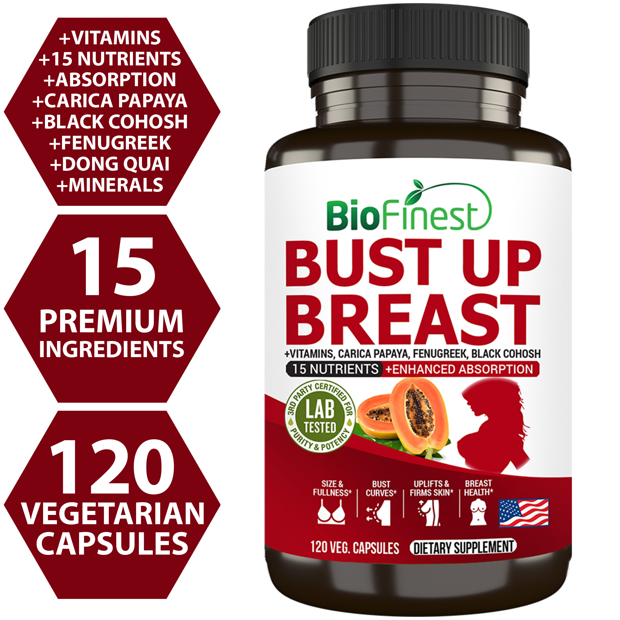 Biofinest Bust Up Breast Supplement – Fast Absorption Carica Papaya Dong Quai Black Cohosh Fenugreek Blessed Thistle Soy Isoflavones Vitamin – Natural Bustline Lifting Firming Toning Breast Cup Size Skin Shape Enhancement (120 Veg. Capsules)