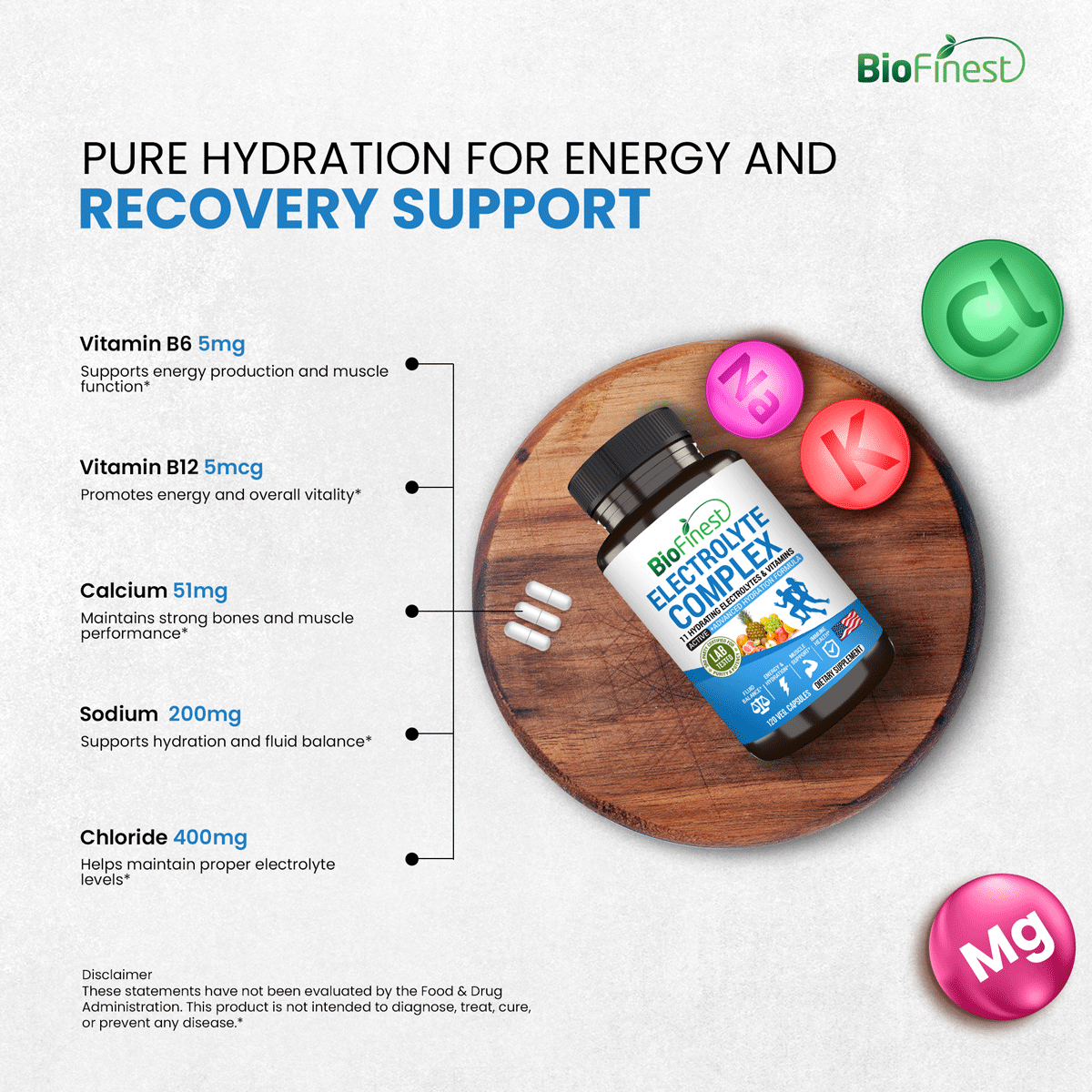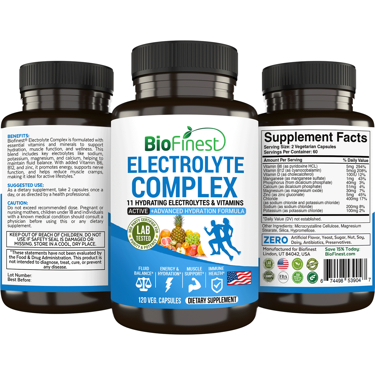 Biofinest Electrolyte Complex Supplement - 11 Hydrating Electrolytes Vitamin B D Minerals Calcium Magnesium Zinc Manganese Phosphorus Sodium Potassium Chloride - Fluid Salt Balance Muscle Cramps Recovery Energy Hydration Workout (120 Veg. Capsules)
