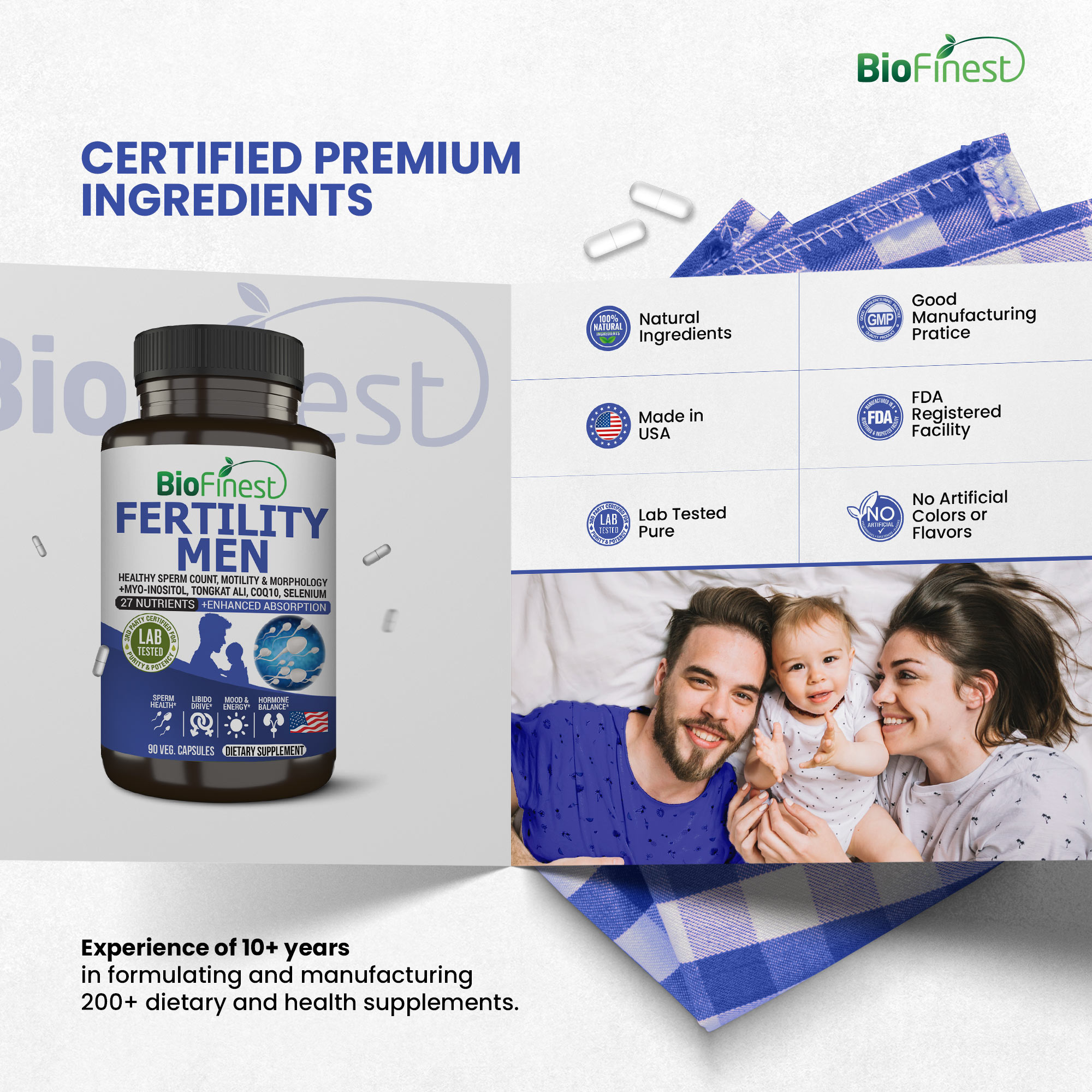 Biofinest Fertility Men™ Multivitamin is formulated with a comprehensive blend of 27 ingredients, including essential vitamins, minerals, and herbal extracts, designed to support male fertility and reproductive health. The supplement is meticulously crafted to support sperm health and production, support hormonal health, libido and testo health, offer antioxidant protection, and healthy energy metabolism. This combination of benefits works synergistically to support male fertility and reproductive wellness, including sperm quality, motility, and prostate health.