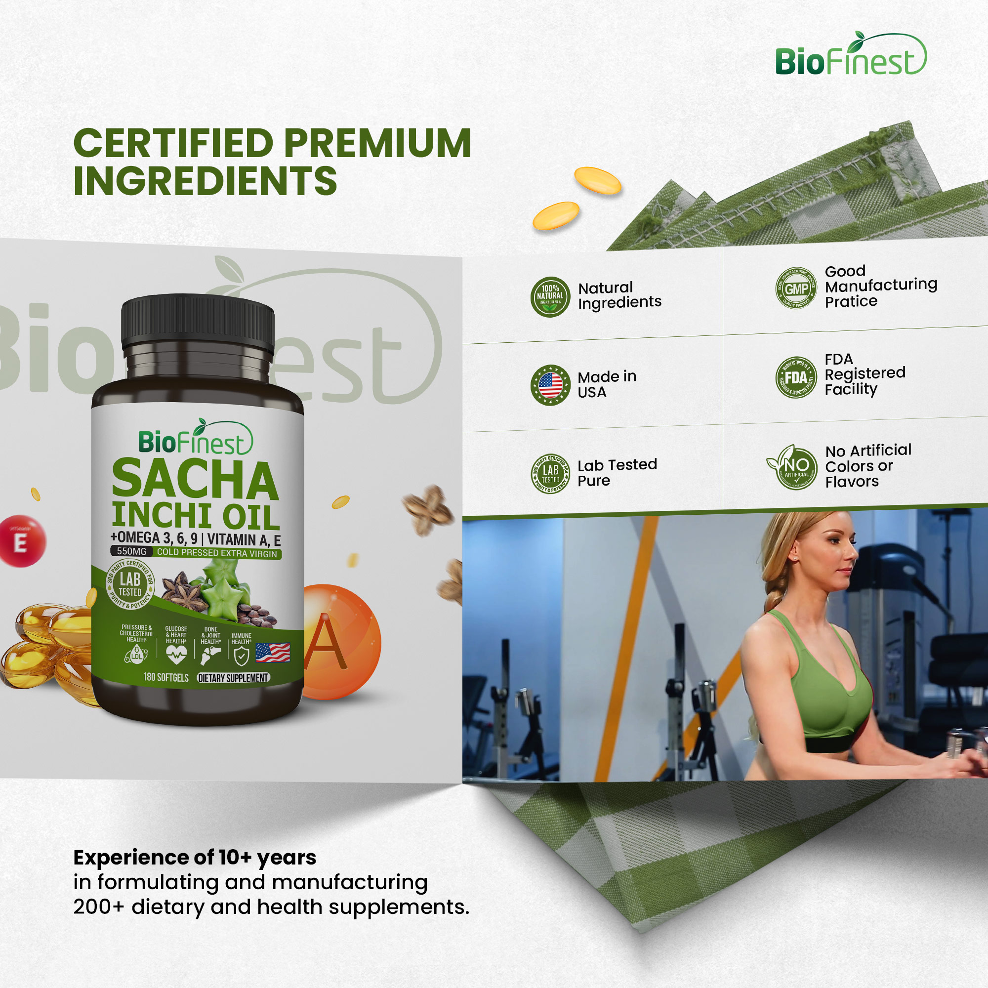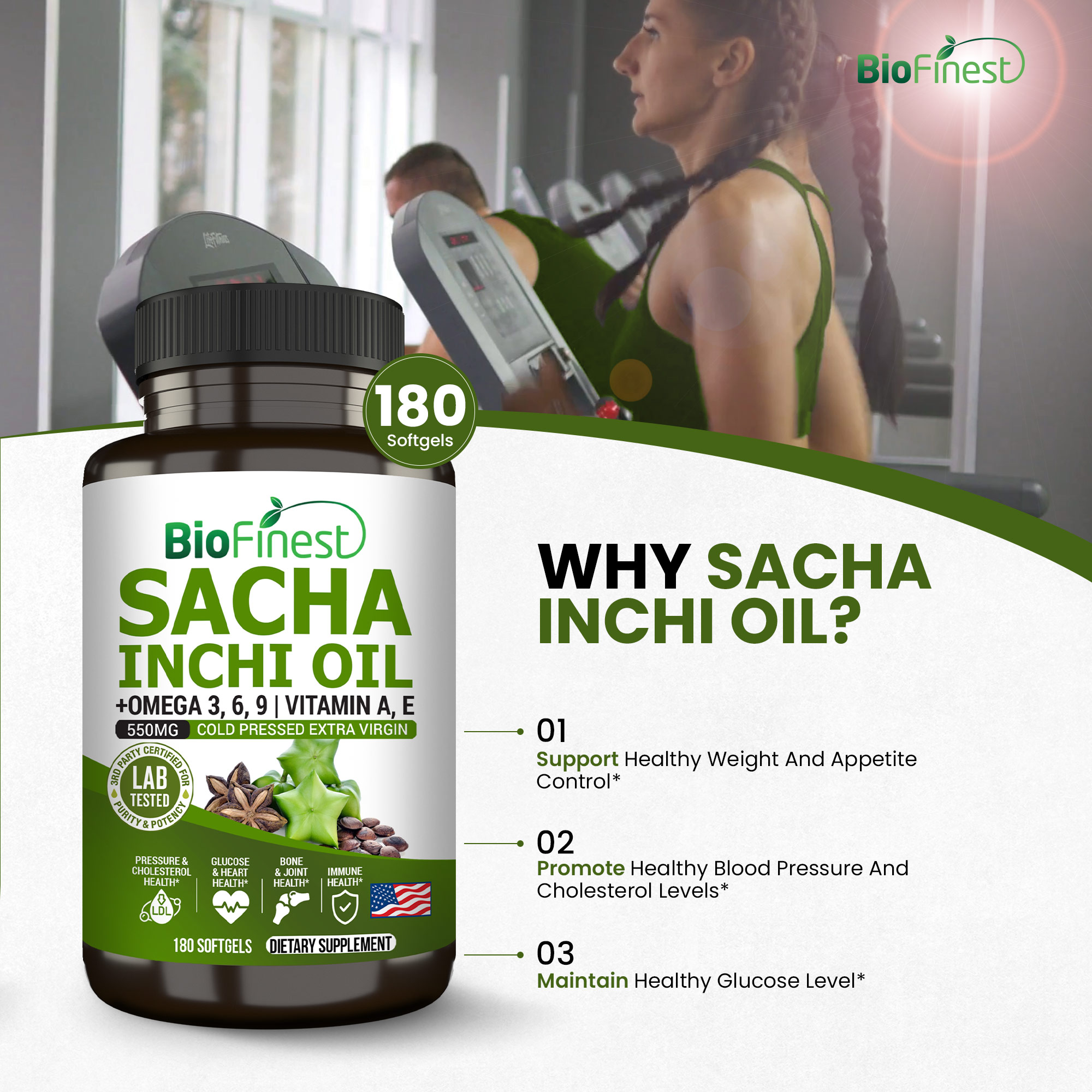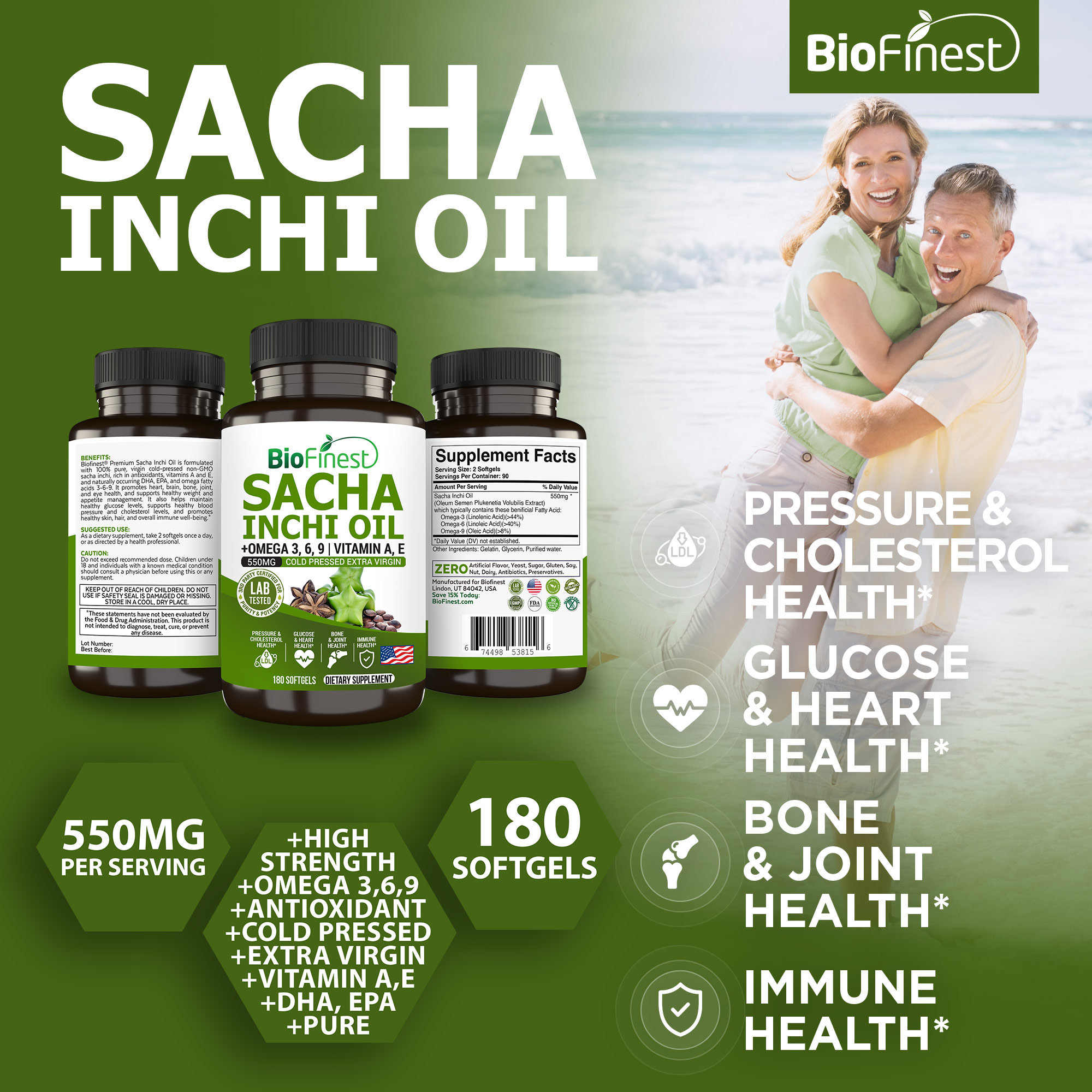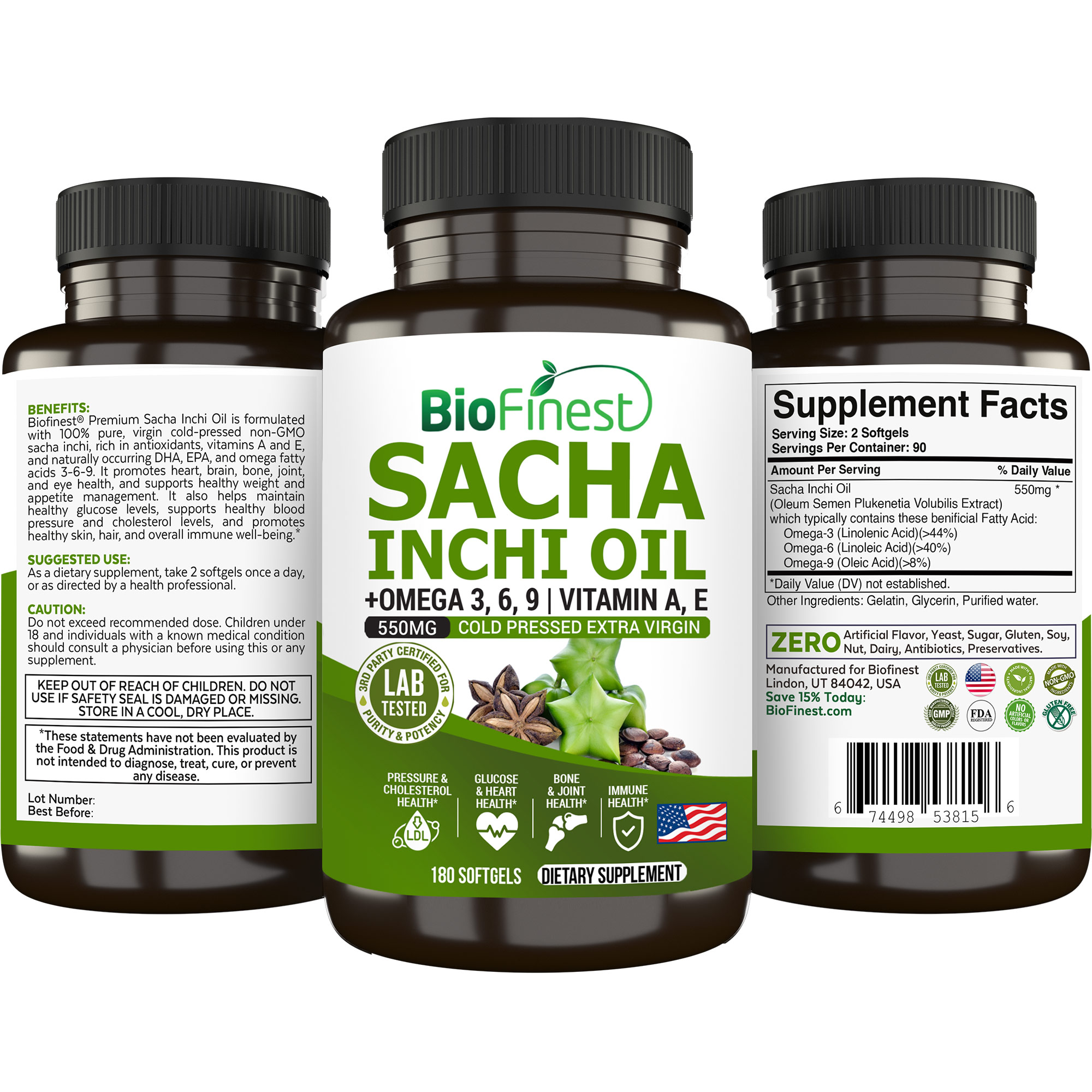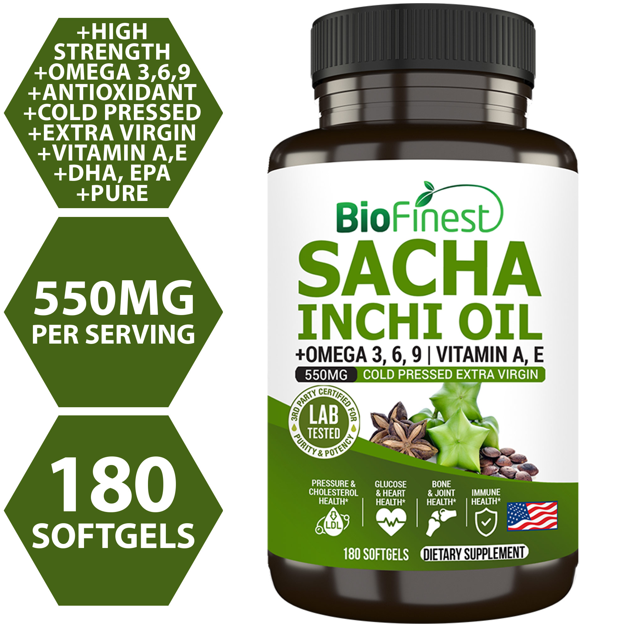 Biofinest Sacha Inchi Oil 550mg Supplement - Pure Extra Virgin Cold Pressed Non-GMO Omega 3 6 9 Vitamin A E Antioxidant DHA EPA - Healthy Heart Brain Eye Bone Joint Appetite Glucose Blood Pressure Cholesterol Skin Hair Immune 印加果油 (180 Softgels)