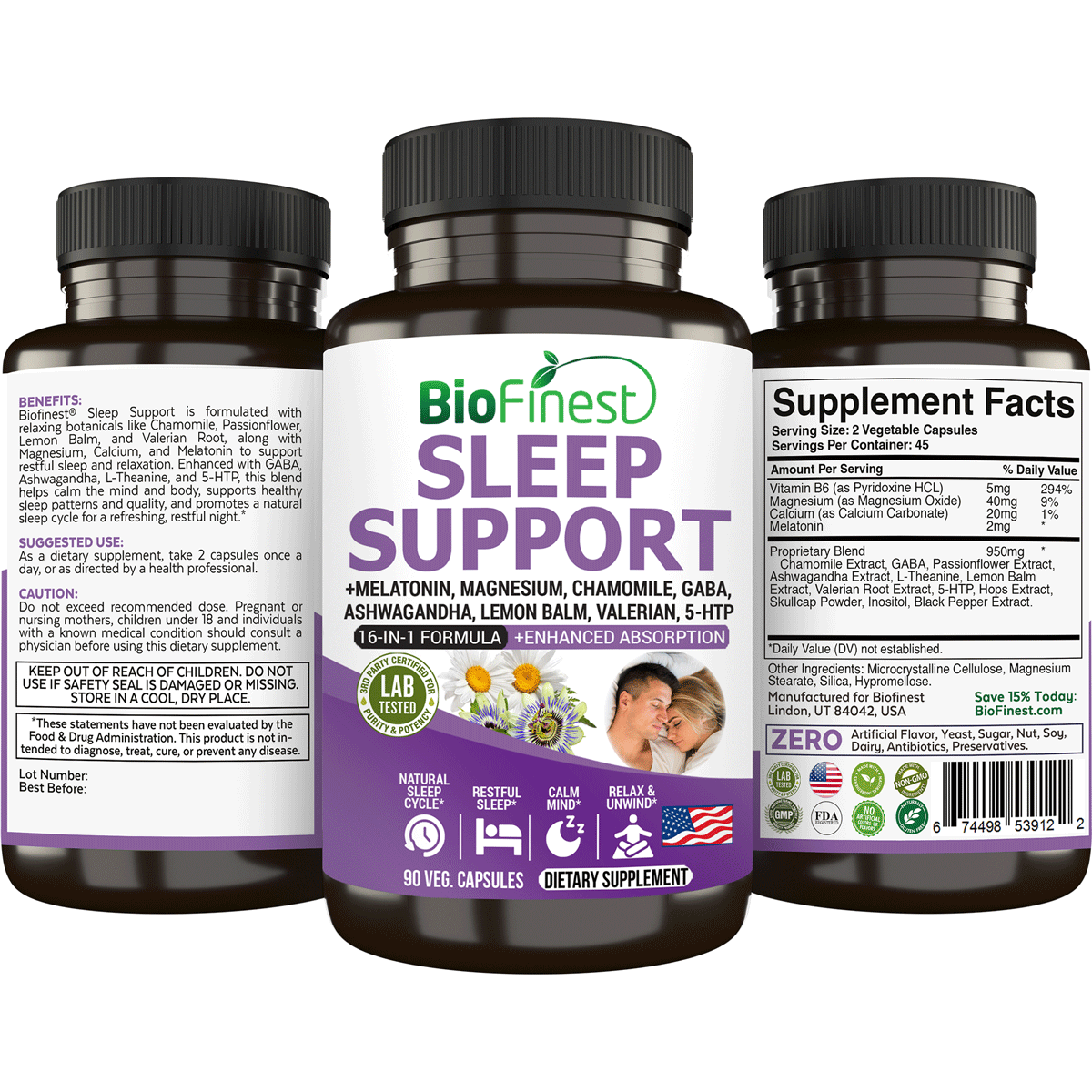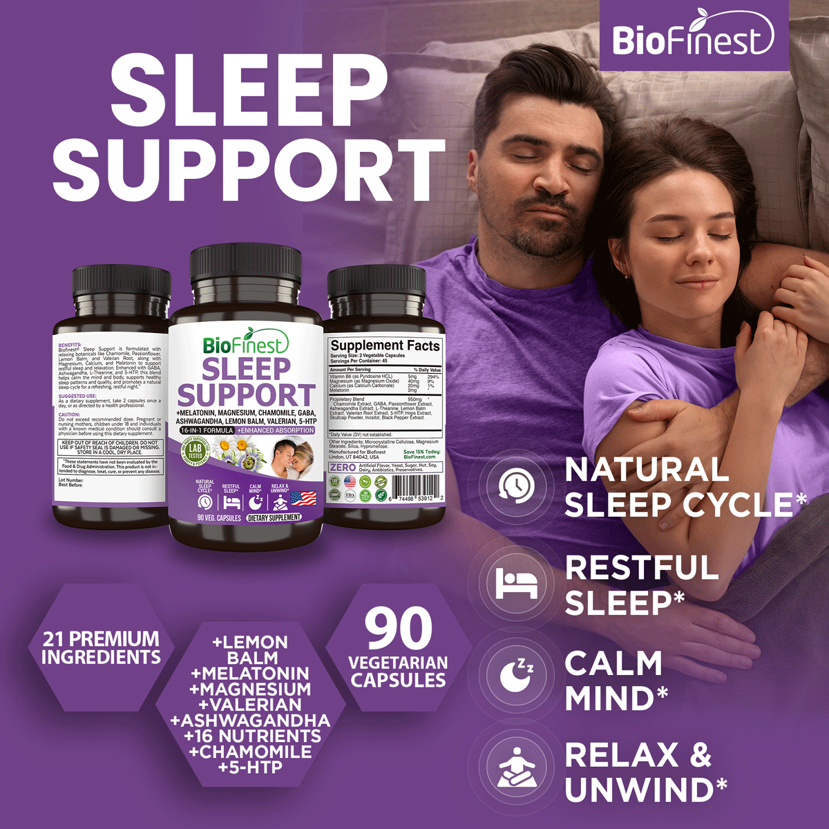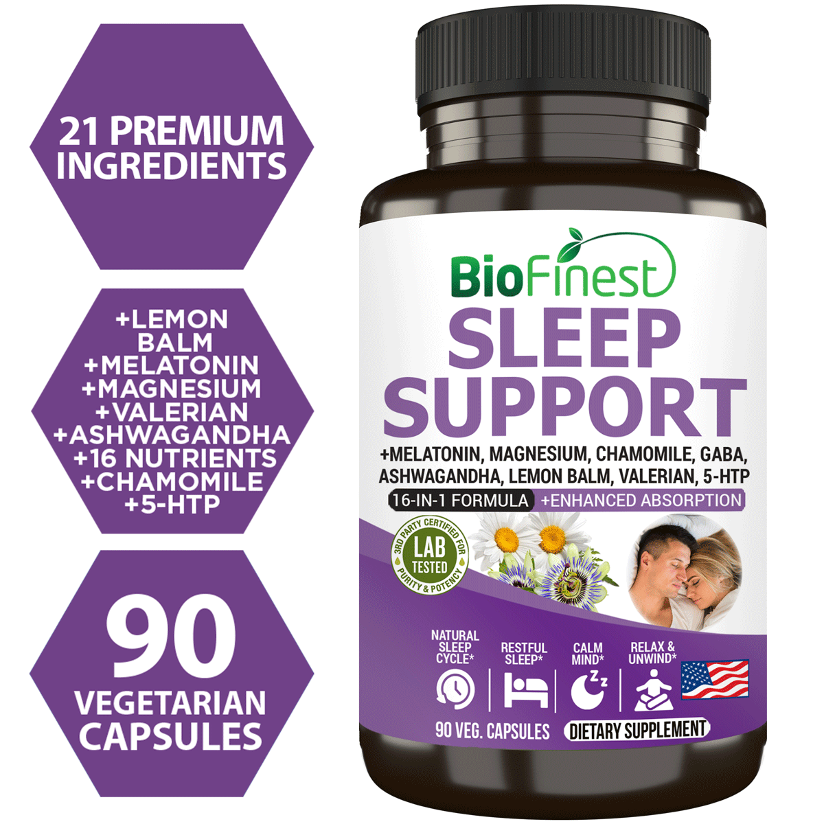 Biofinest Sleep Support Supplement - 16-in-1 non-drowsy Melatonin Ashwagandha Chamomile GABA Lemon Balm L-Theanine Passion Flower 5-HTP Calcium Magnesium Vitamin B - Calm Relax Mind Body Nighttime Insomnia Aid Deep Restful Sleep Cycle (90 Veg. Capsules)