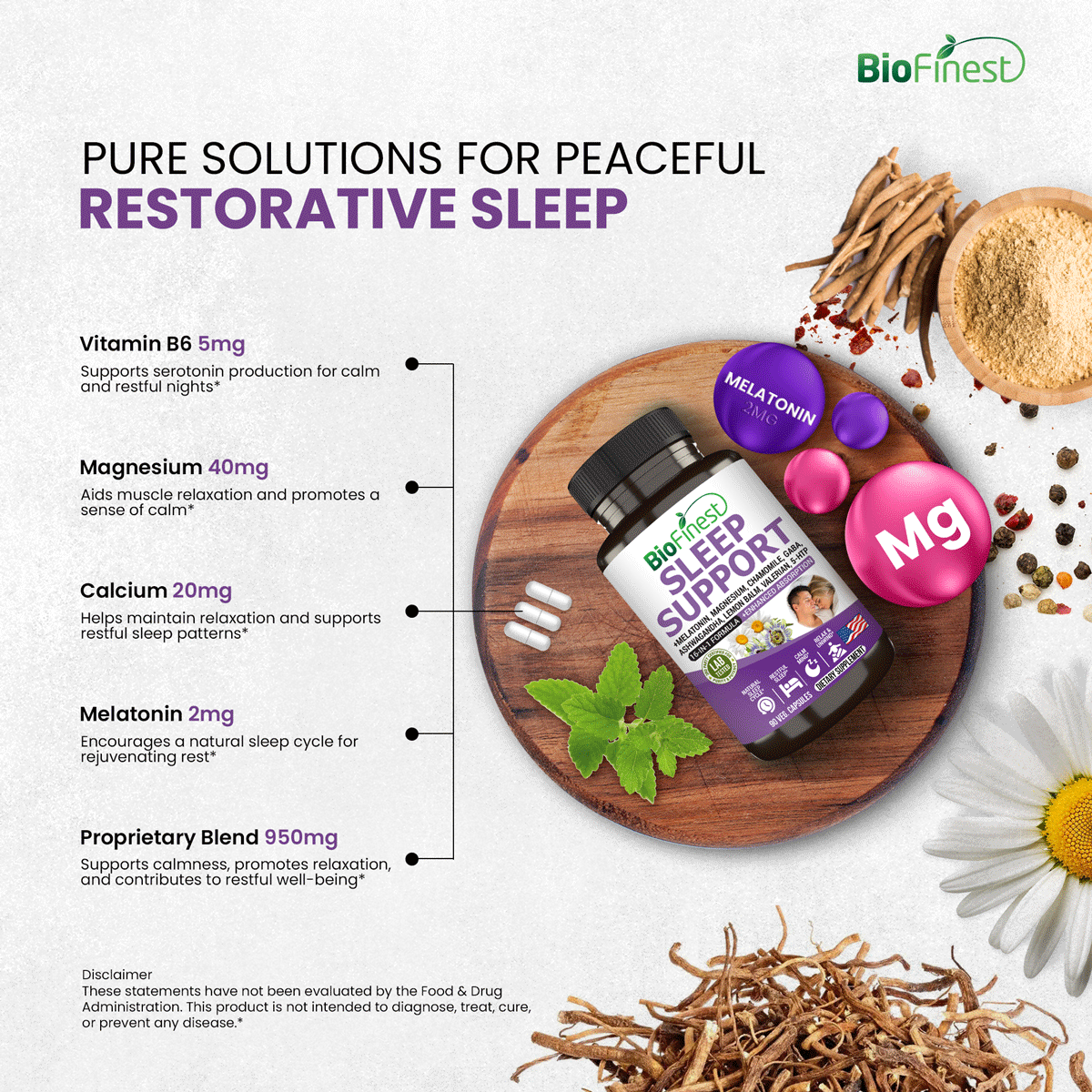 At the core of Biofinest® Sleep Support are botanicals known for their traditional use in promoting calm and relaxation. Chamomile and Passionflower have been used to support a relaxed state, while Lemon Balm and Valerian Root are commonly included in formulas for their soothing effects. These natural ingredients work together to help create a calming environment, supporting a peaceful transition into sleep.