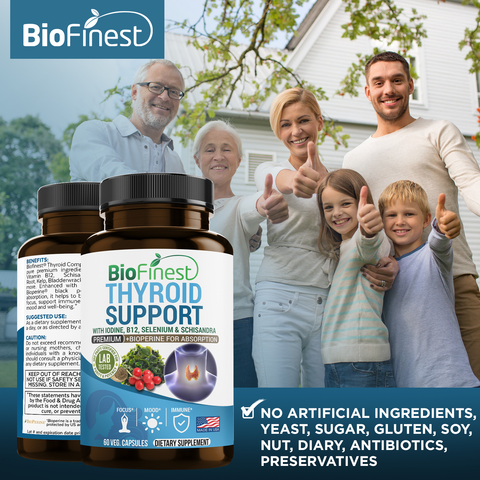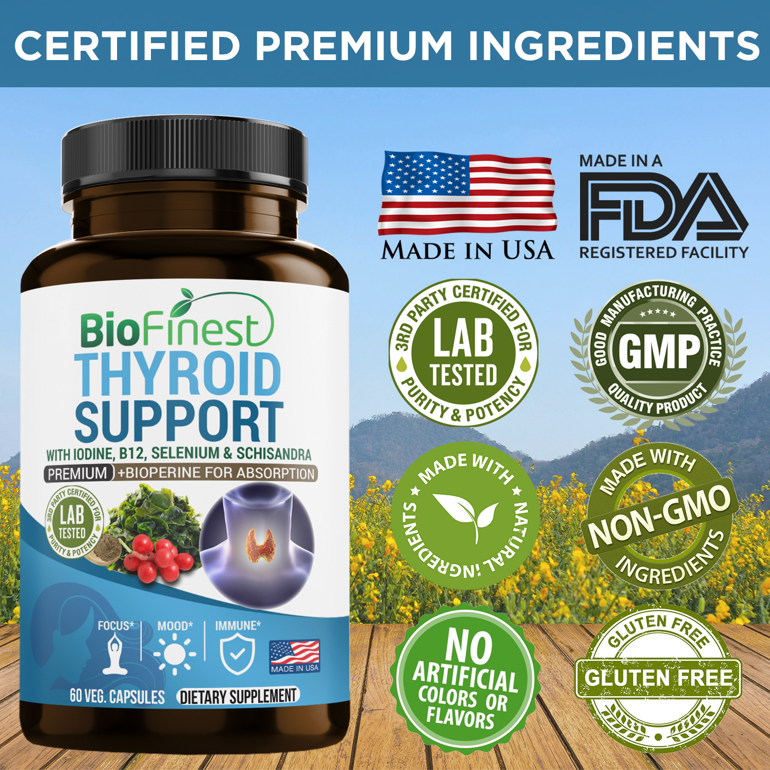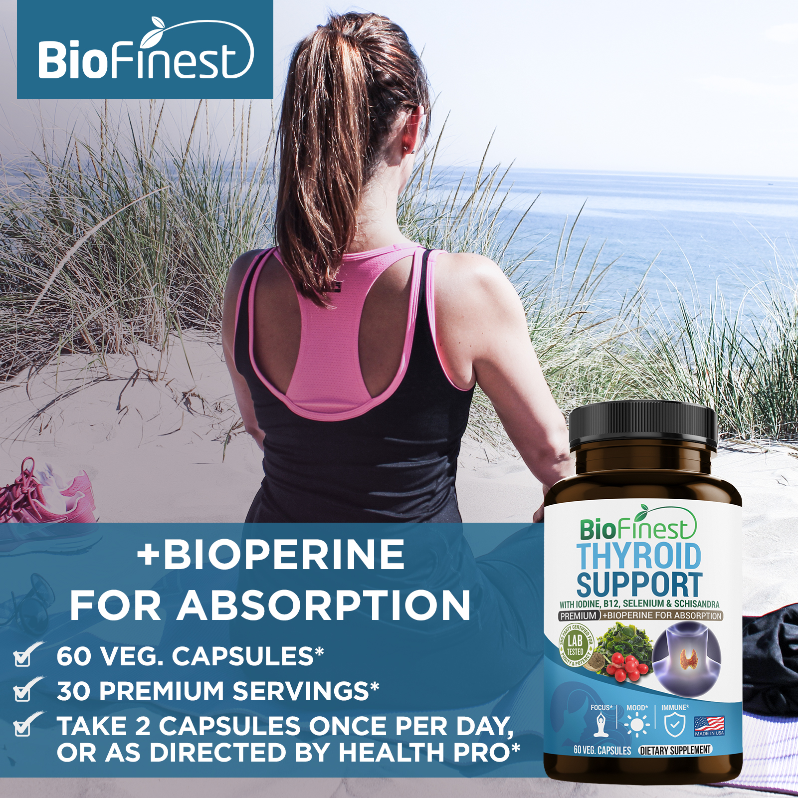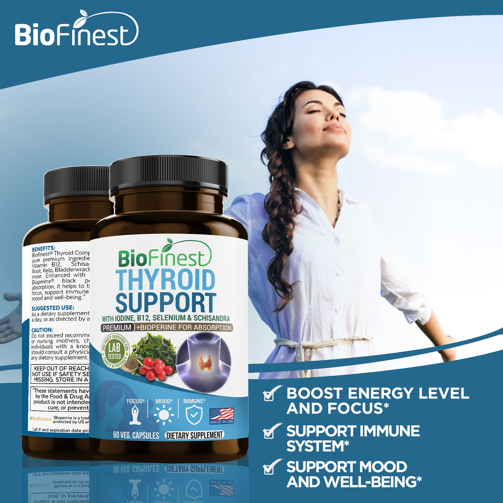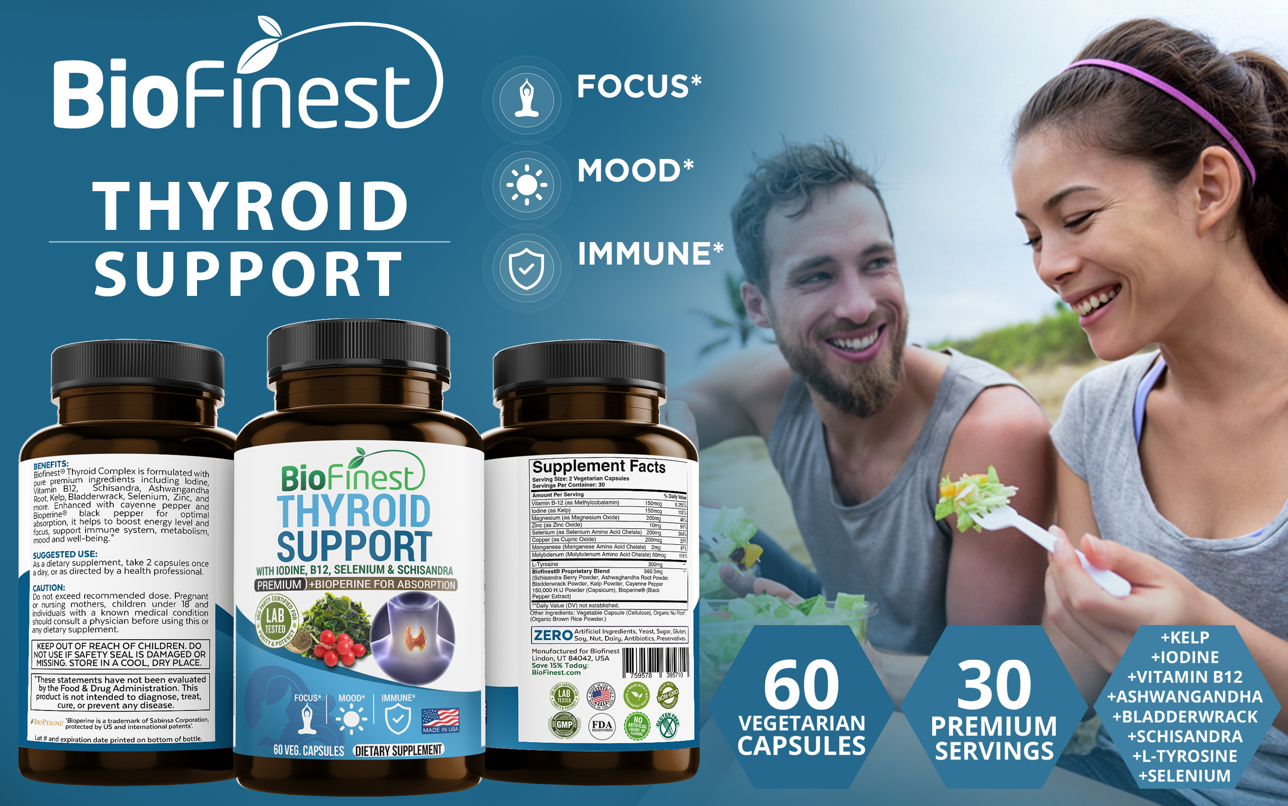 | Ingredients | 300mg L-tyrosine, 200mg Selenium, 200mcg of Magnesium, 150mcg Vitamin B12, 150mcg Iodine, Schisandra, Bladderwrach, Zinc, Bioperine and more. |